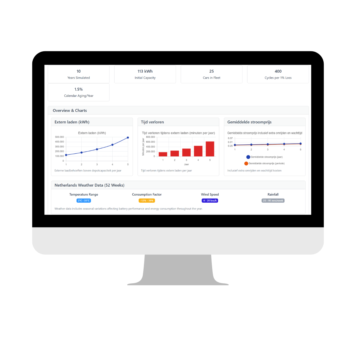 Wordt het waterstof of toch batterijelektrisch? Wat is je energiebehoefte? Wat is de optimale batterijgrootte? Wat betekent het voor de rijd- en laadtijd van elke truck? Wat is de invloed van batterijdegradatie? En van het weer? Wat is het kostenplaatje onderaan de streep?